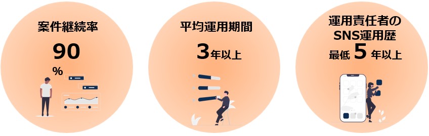 当社のSNS支援は、短期的な数値改善だけを目的としたものではありません。多くのクライアント様と長期的な運用を継続しており、高い継続率を維持しています。定期的な振り返りと改善を重ねながら、環境変化に応じて運用を最適化し、持続的な成果創出を目指します。